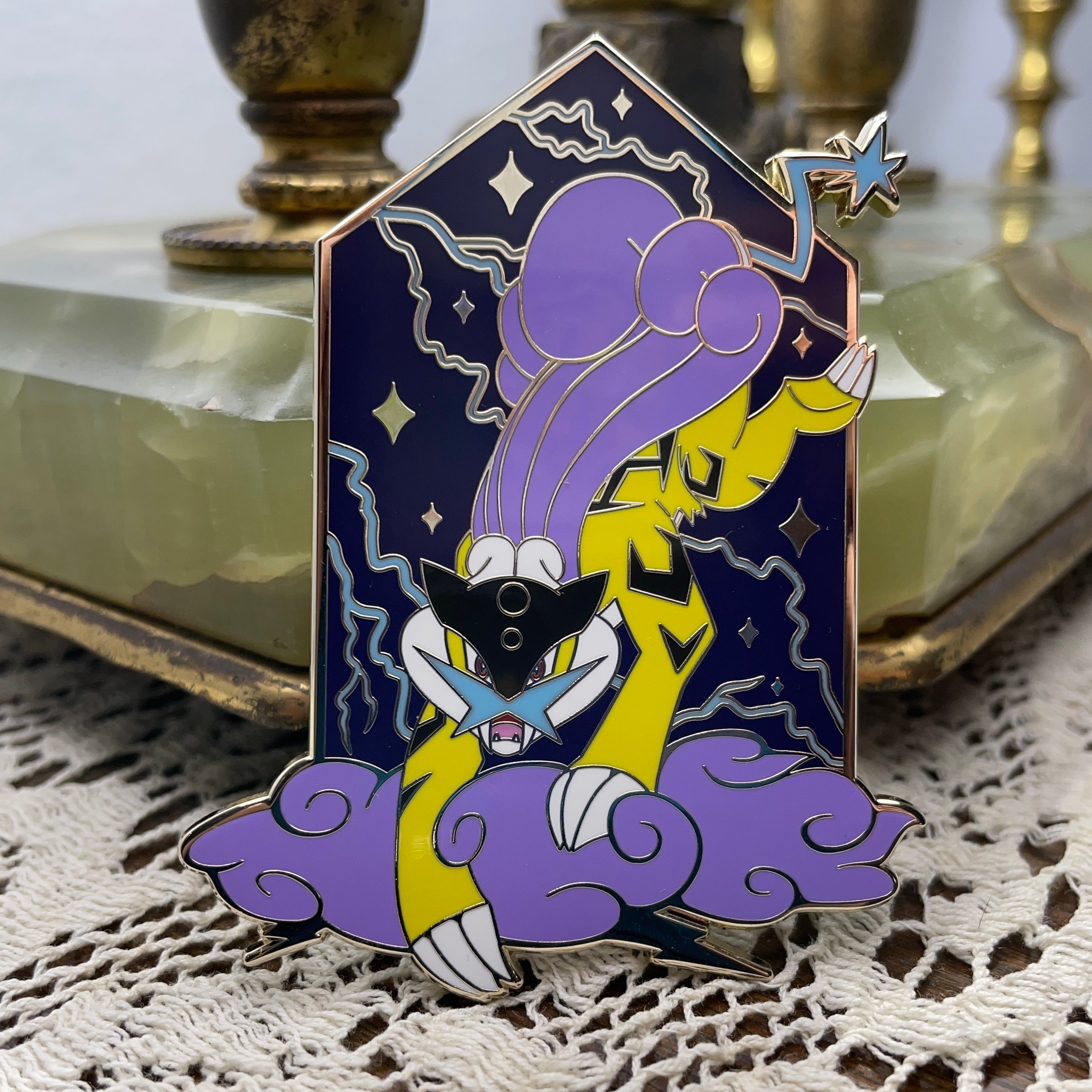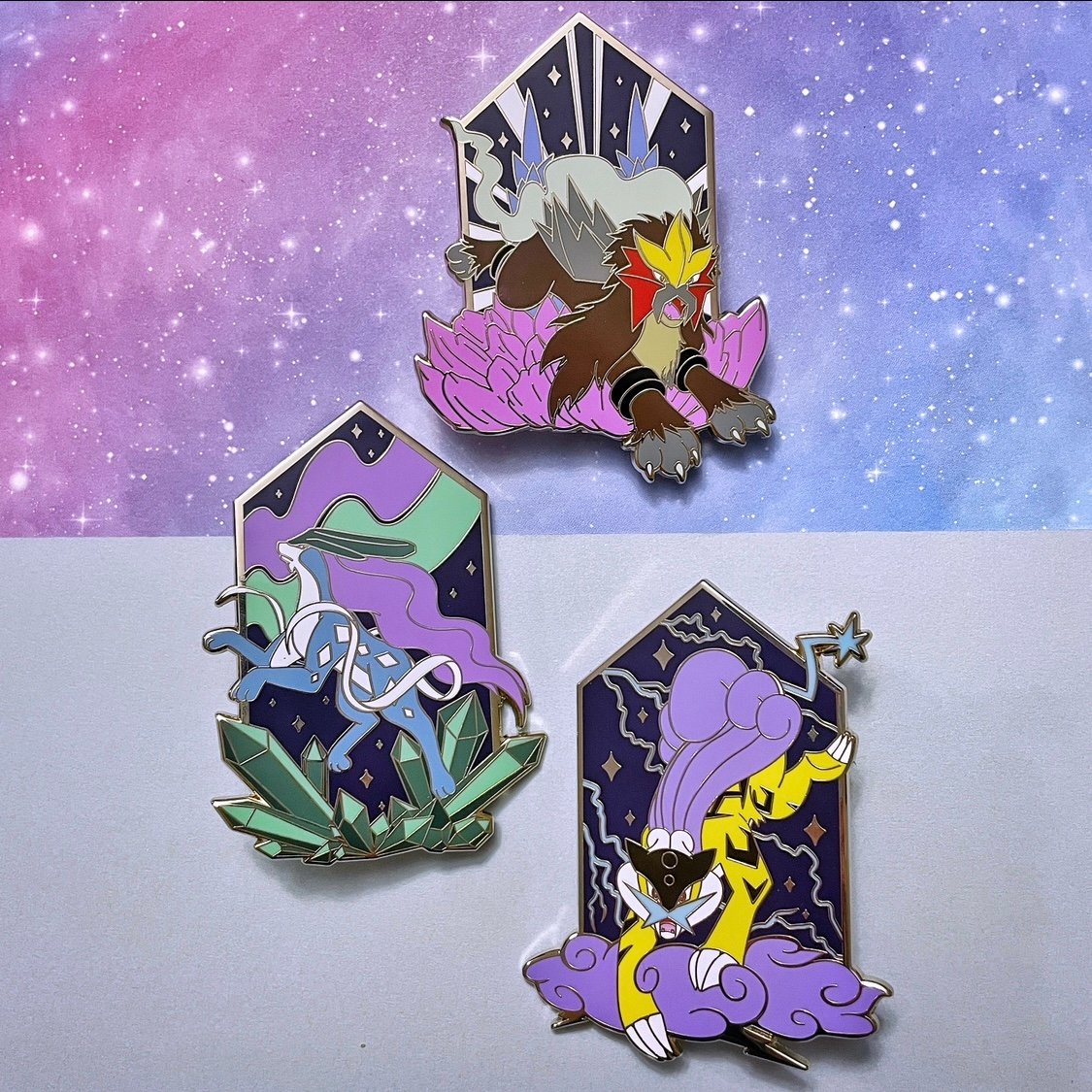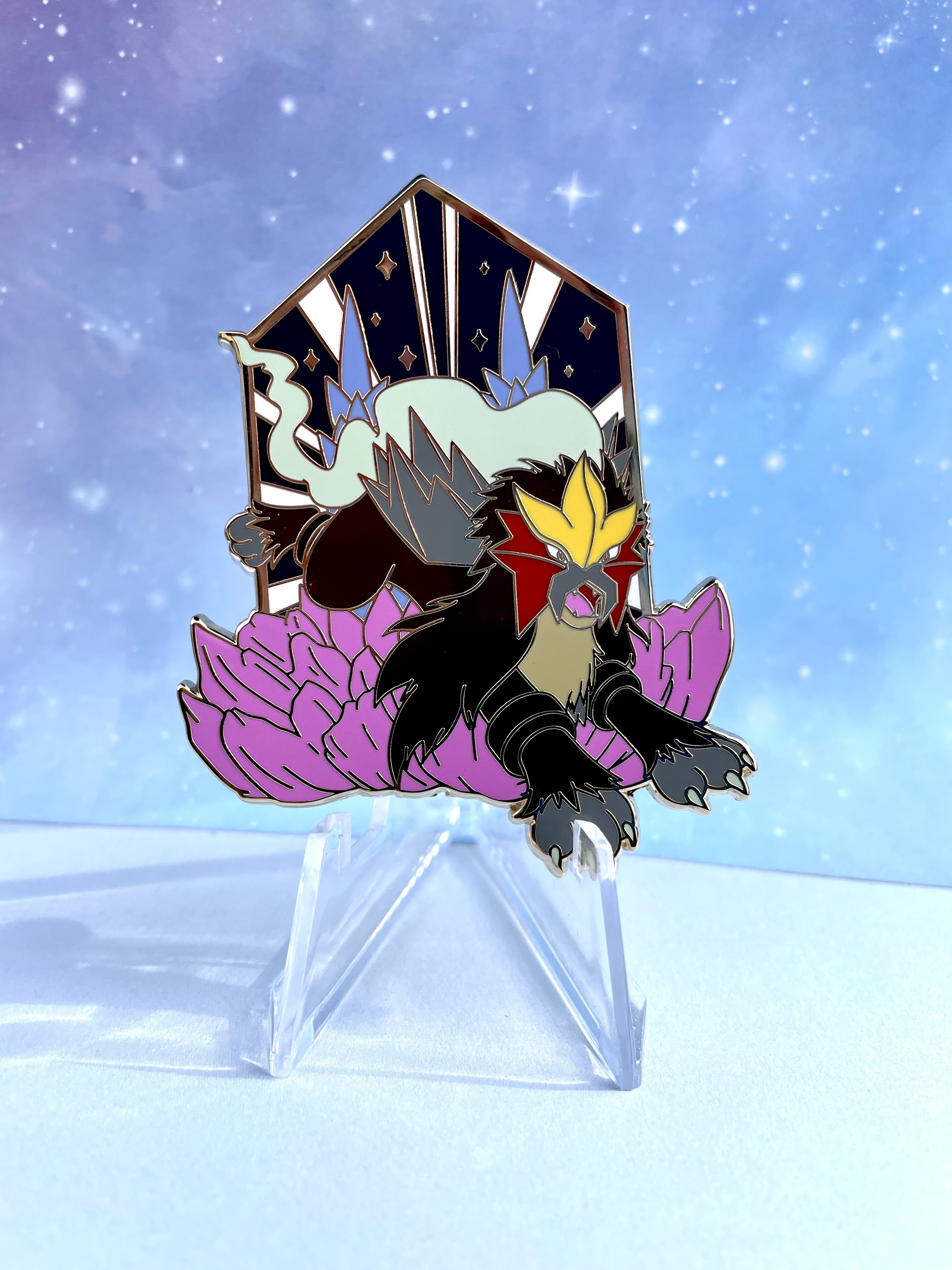 3 inch tall, gold plated hard enamel pins depicting one of three legendary beasts Comes with two rubber clutches on the back Pins come with a free sticker while supplies last!