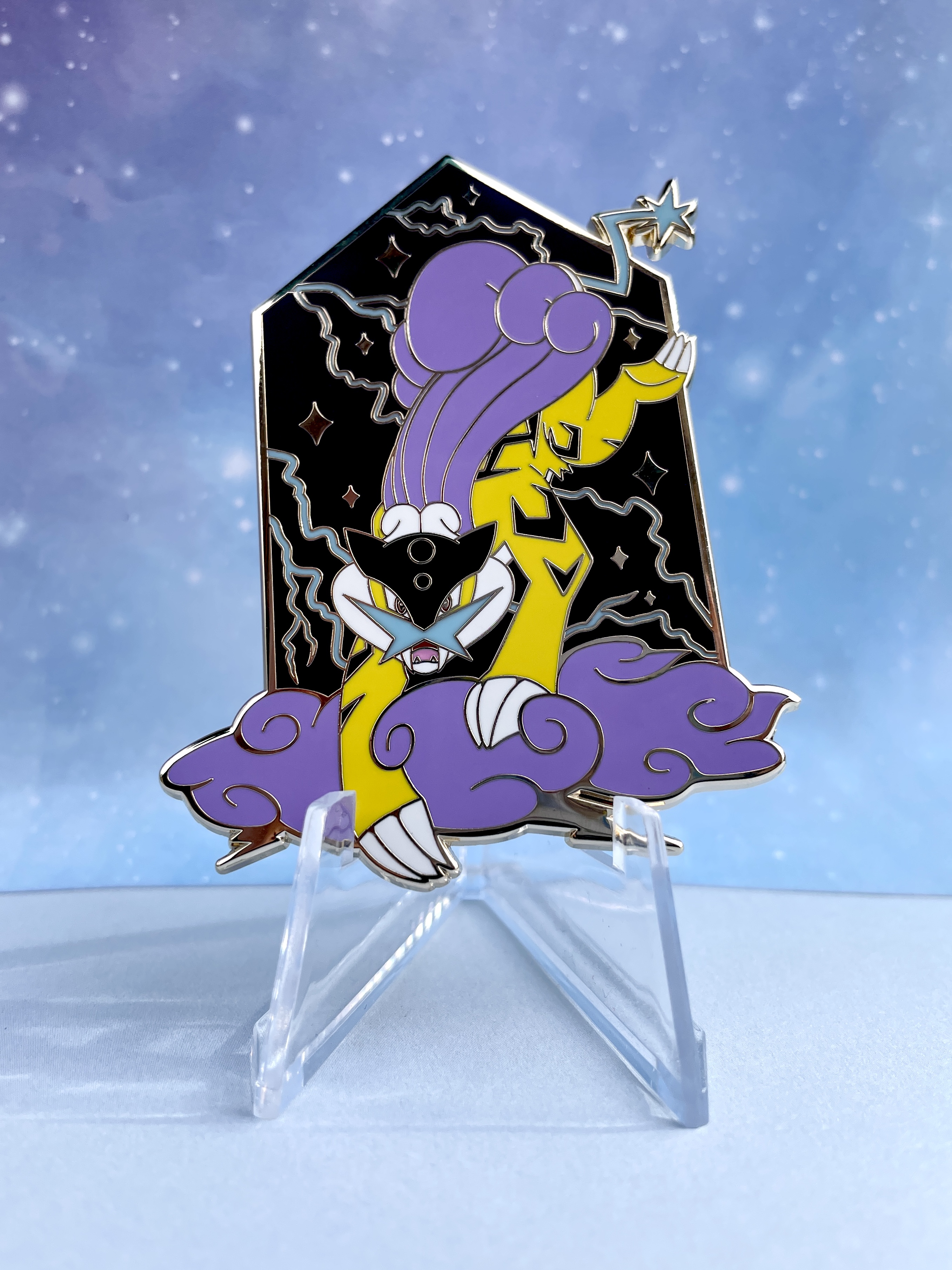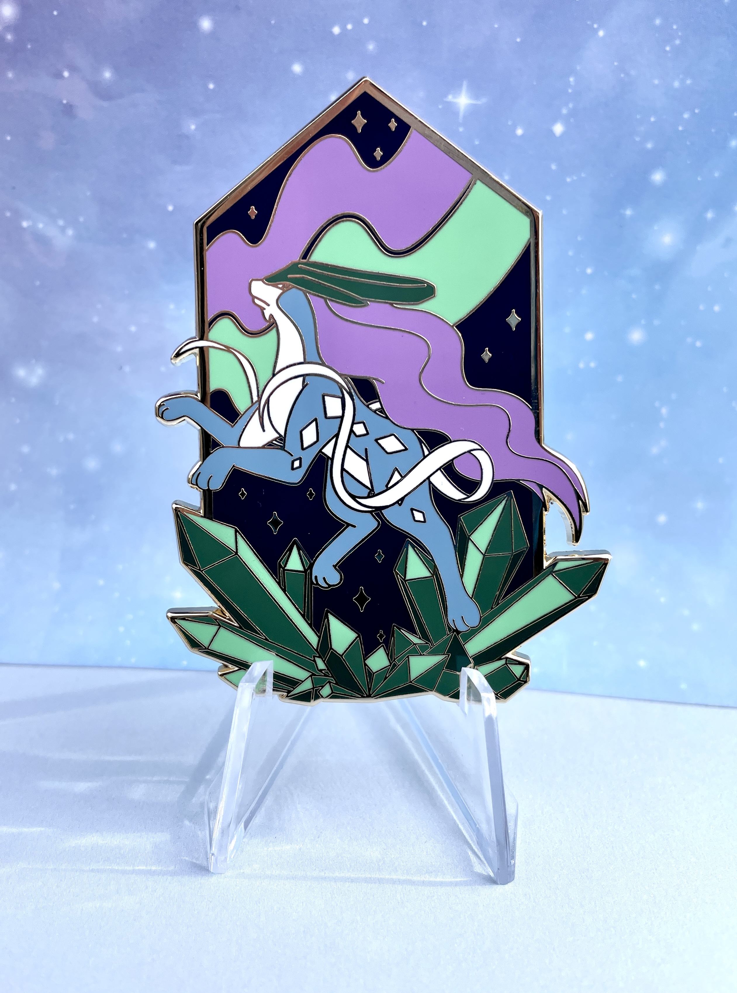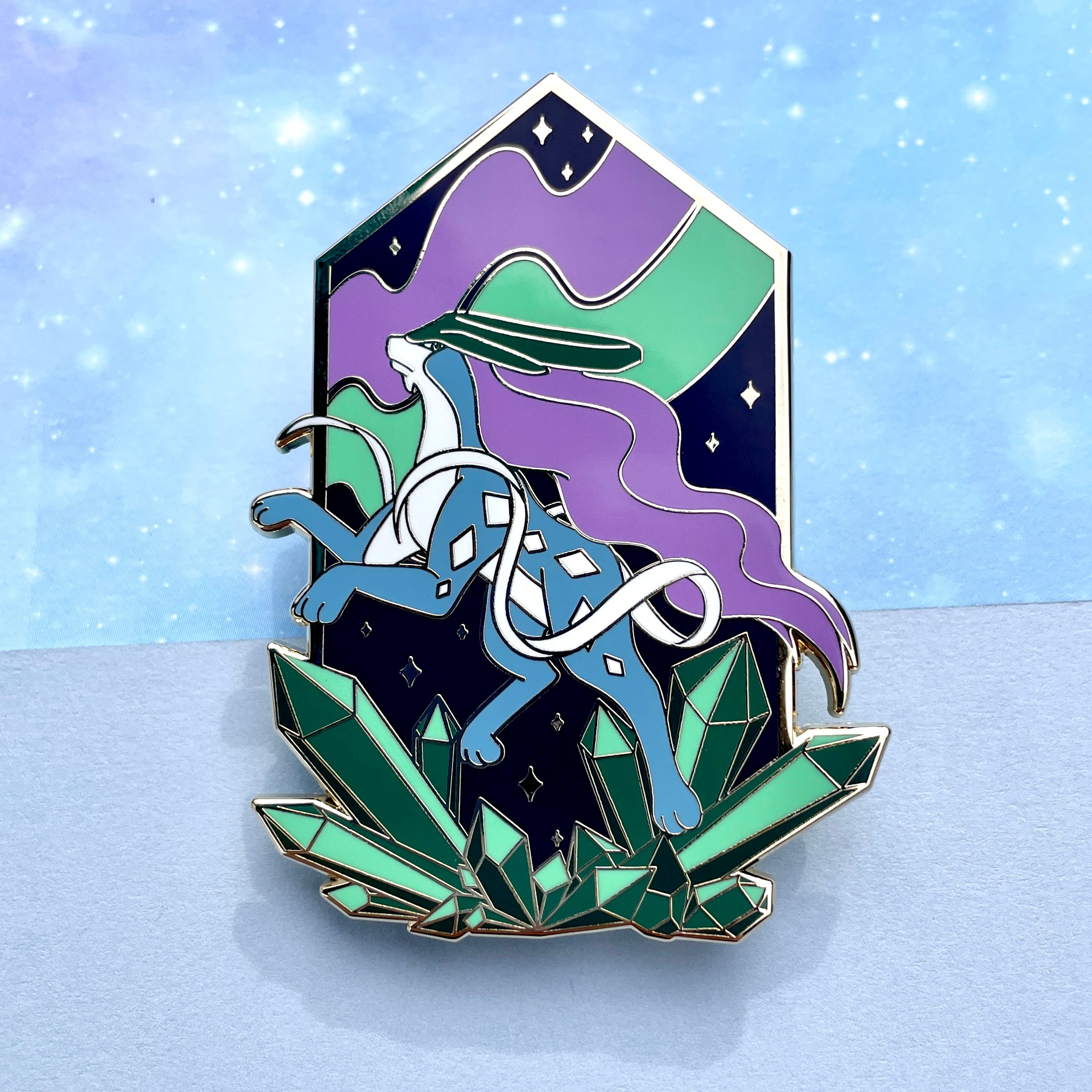 3 inch tall, gold plated hard enamel pins depicting one of three legendary beasts Comes with two rubber clutches on the back Pins come with a free sticker while supplies last!