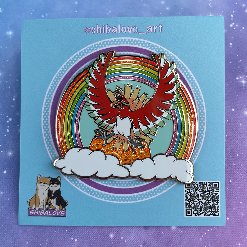 2 inch tall, gold plated hard enamel pin depicting a bird with a rainbow Comes with two rubber clutches on the back